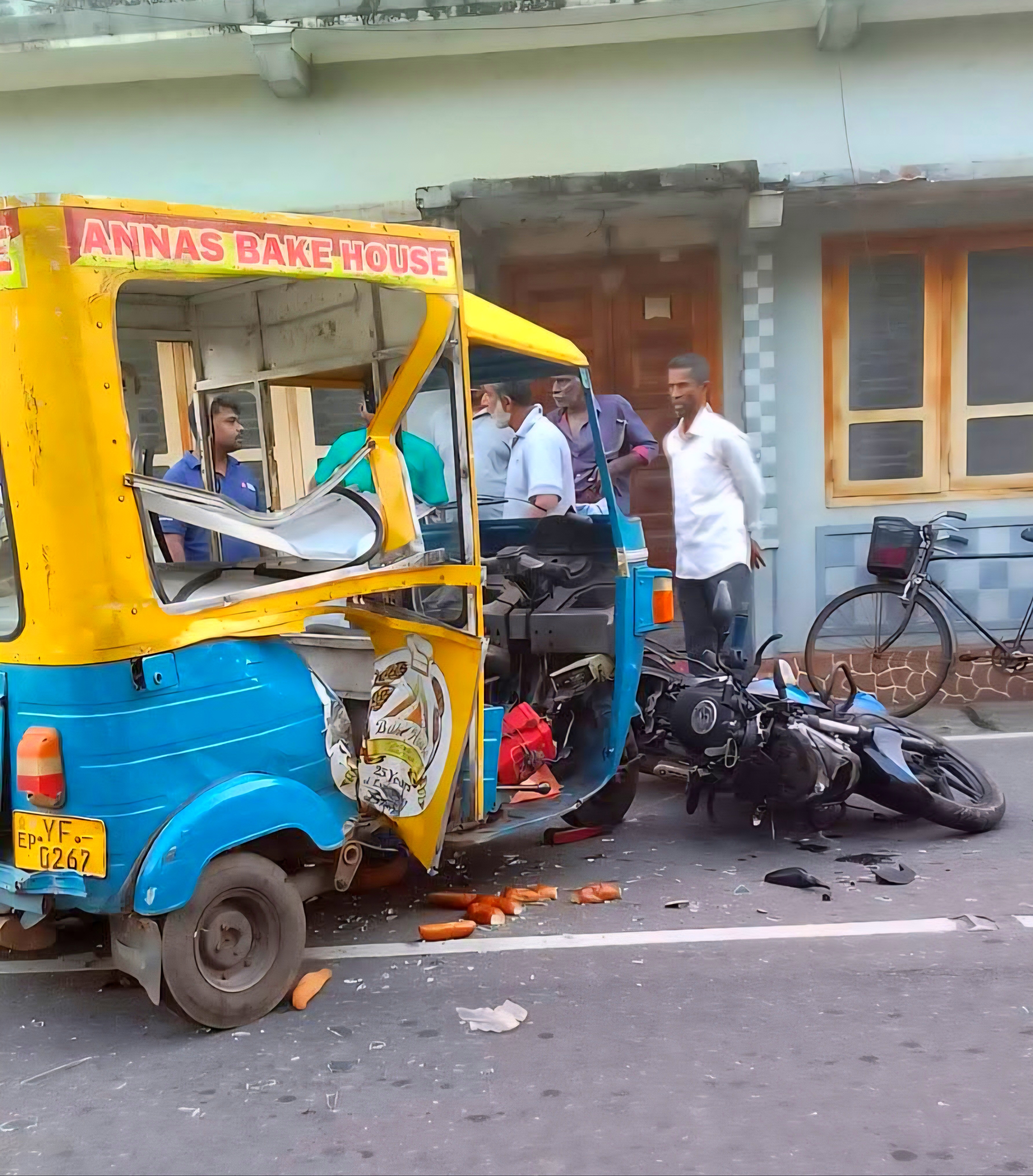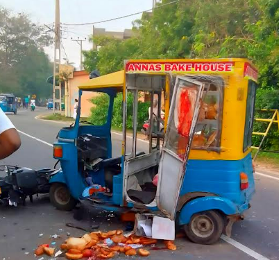 இன்று அதிகாலை பேக்கரி உற்பத்திப் பொருட்களை ஏற்றிக்கொண்டு காலை நேர வியாபாரத்திற்காகச் சென்றுகொண்டிருந்த முச்சக்கரவண்டியும், மோட்டார் சைக்கிளும் நேருக்கு நேர் மோதி விபத்துக்குள்ளாகின.