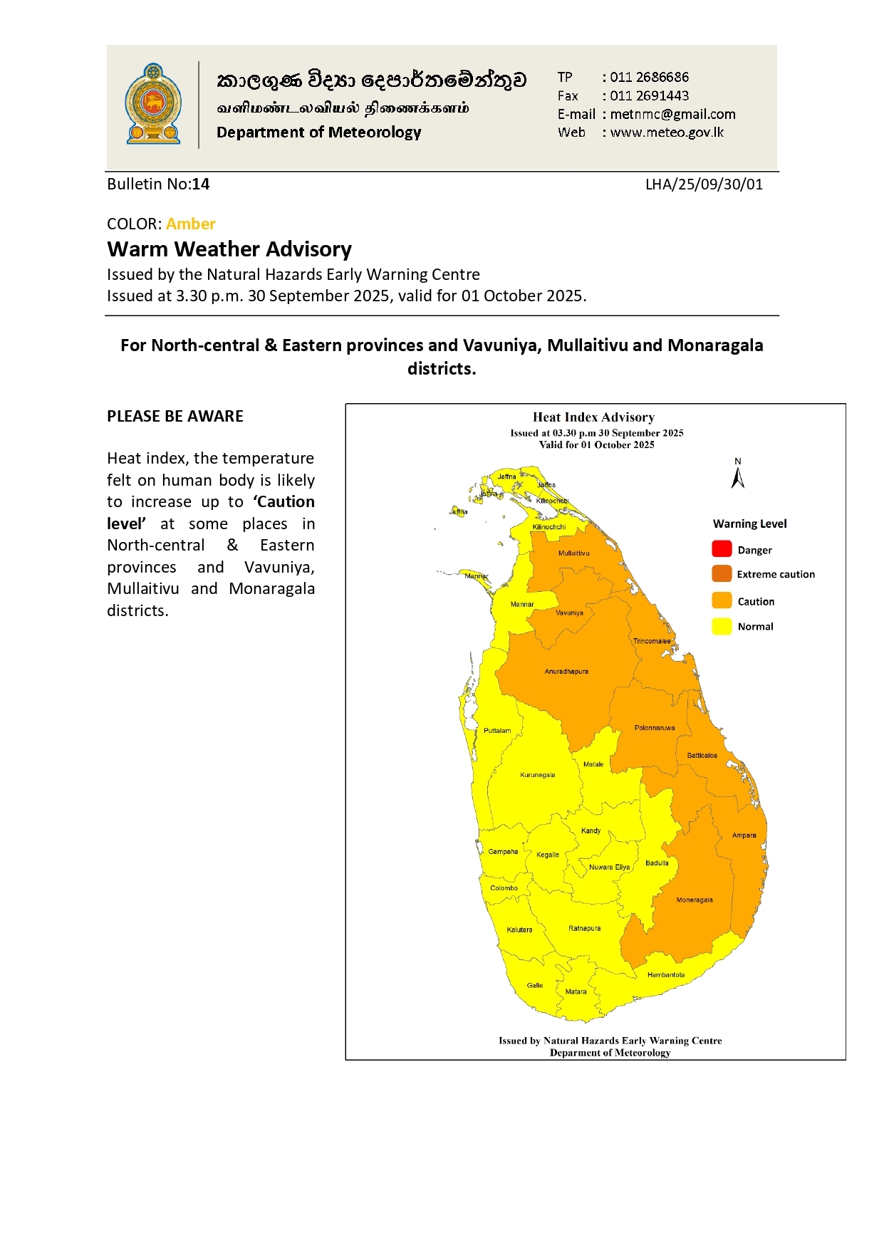 நாளை அதிகரிக்கும் வெப்பம்; 08 மாவட்டங்களுக்கு அம்பர் எச்சரிக்கை வடமத்திய மற்றும் கிழக்கு மாகாணங்களுக்கும் வவுனியா, முல்லைத்தீவு மற்றும் மொனராகலை மாவட்டங்களுக்கும் வெப்பமான வானிலைக்கான எச்சரிக்கையை வானிலை ஆய்வுத் துறை வெளியிட்டுள்ளது.நாளை அமுலுக்கு வரும் வகையில் 08 மாவட்டங்களுக்கு இவ்வாறு அம்பர் எச்சரிக்கை விடுக்கப்பட்டுள்ளது.மனித உடலில் உணரப்படும் வெப்பநிலையான வெப்பக் குறியீடு, மாவட்டங்களில் சில இடங்களில் 'எச்சரிக்கை நிலை' வரை அதிகரிக்க வாய்ப்புள்ளது.நீண்ட நேரம் வெயிலில் இருத்தல் அல்லது செயல்பாடுகளால் சோர்வு ஏற்பட வாய்ப்புள்ளது என்றும், வெப்பத்தால் தசைப் பிடிப்பு ஏற்படக்கூடும் என்றும் பொதுமக்களுக்கு வானிலை ஆய்வுத் துறையால் எச்சரிக்கப்பட்டுள்ளது.
