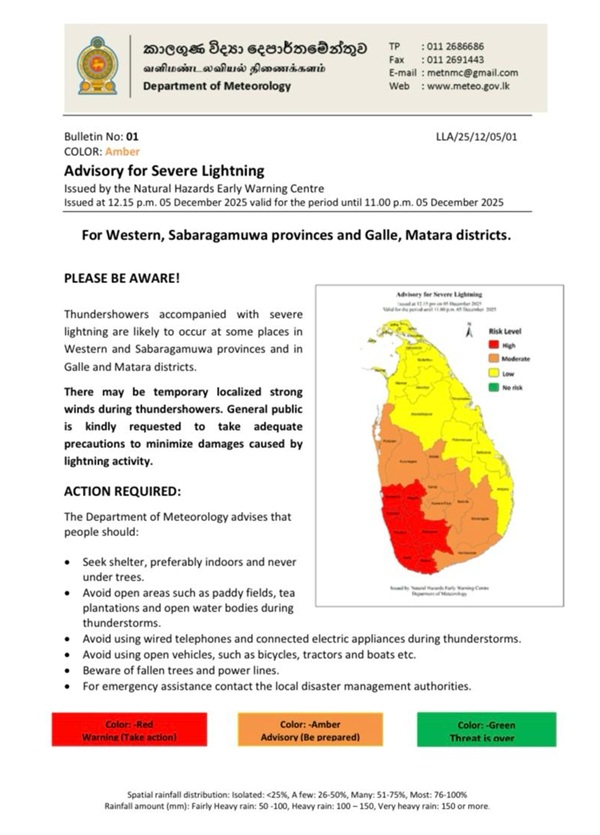 மேல், சப்ரகமுவ மாகாணங்களுக்கும் காலி மற்றும் மாத்தறை மாவட்டங்களுக்கும் பலத்த மின்னல் தாக்கம் குறித்த எச்சரிக்கை விடுக்கப்பட்டுள்ளது.