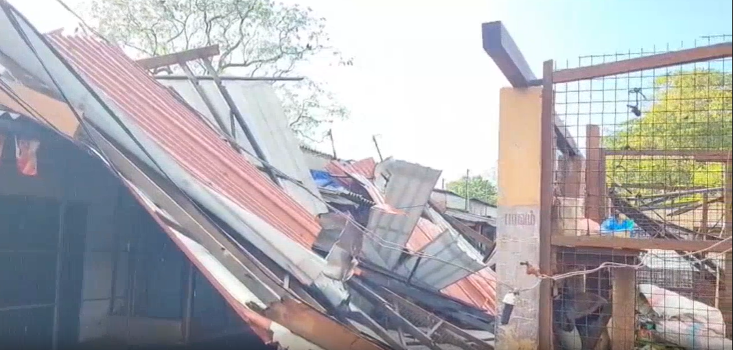 பலத்த காற்றின் தாக்கத்தில் சந்தை வளாகத்தின் கூரைகள் சரிந்து விழுந்துள்ளது.