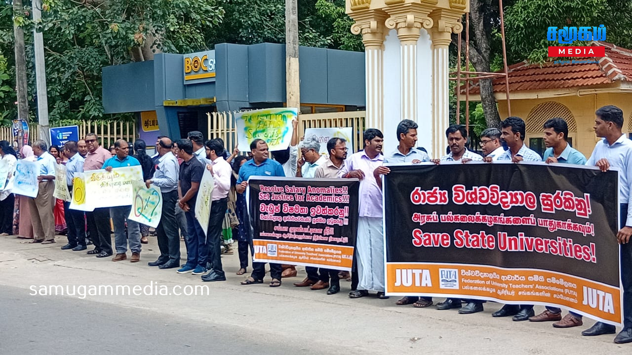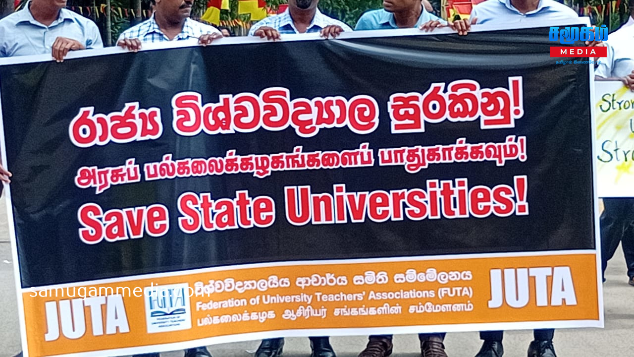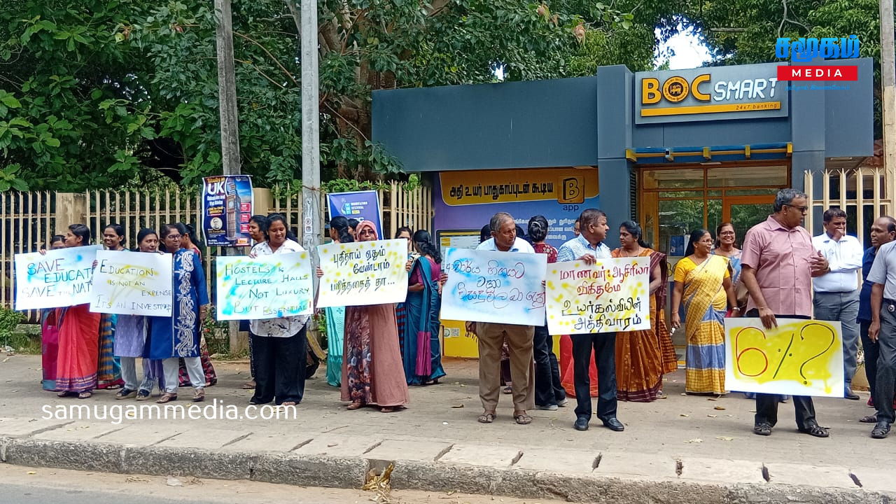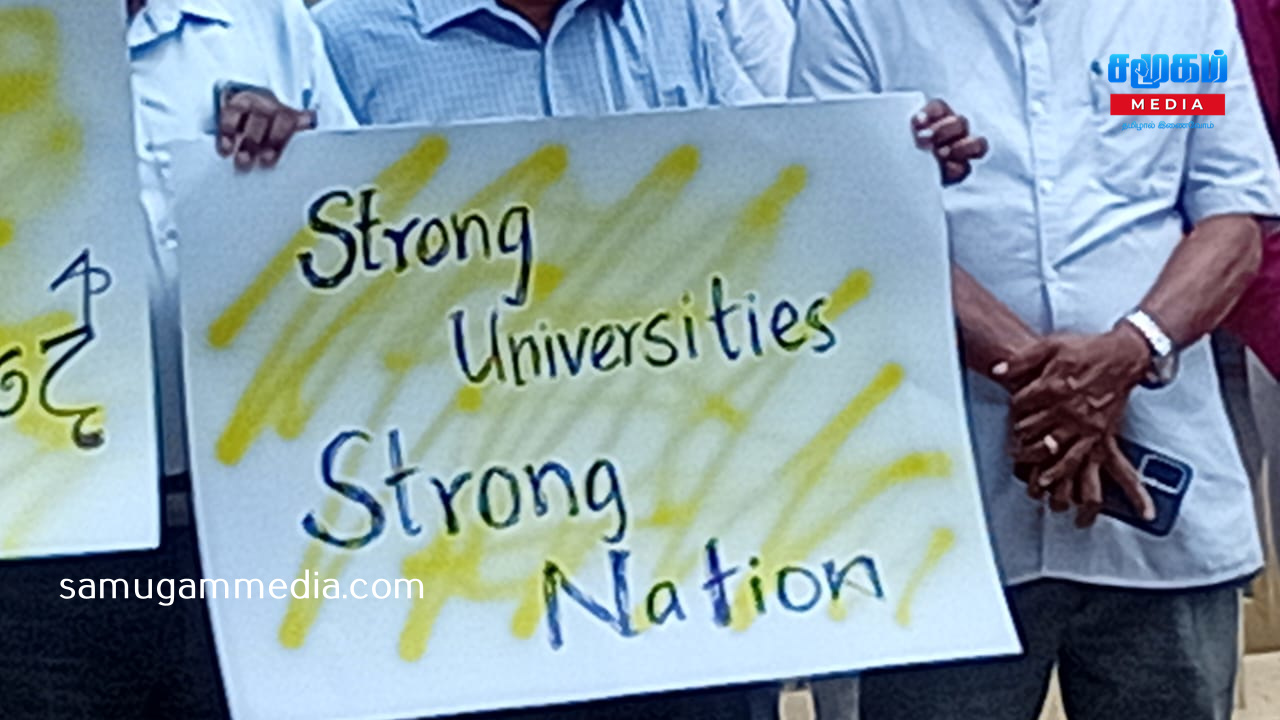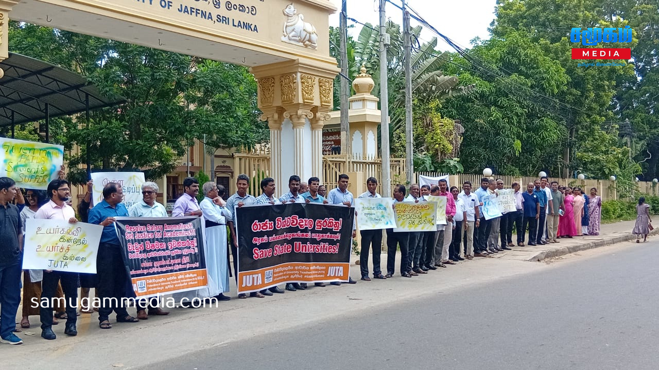 உரிமைகளை தர பின்னடிக்கும் அநுர அரசு; யாழ்.பல்கலை நுழைவாயிலை மறித்து ஆசிரியர் சங்கத்தினர் போர் தமக்கான ஊதிய உயர்வு மற்றும் கடந்தகாலங்களில் கிடைக்கப்பெற்று தற்போது நிறுத்தப்பட்ட சில சலுகைகளை மீள வழங்கல் உள்ளிட்ட பல கோரிக்கைகளை முன்வைத்து யாழ் பல்கலைக்கழக ஆசிரியர் சங்கம், இலங்கை பல்கலைக்கழக ஆசிரியர் சங்கங்களின் சம்மேளனத்துடன் இணைந்து ஒரு நாள் அடையள போராட்டம் ஒன்றை இன்றையதினம் முன்னெடுத்தனர்.யாழ் பல்கலைக்கழகத்தின் பிரதான நுழைவாயிலை மறித்து இன்று காலை முன்னெடுக்கப்பட்ட குறித்த எதிர்ப்பு அடையாளப் போராட்டம் பல்வேறு கோசங்கள் அங்கிய பதாதைகளை ஏந்தியவாறு முன்னெடுக்கப்பட்டது.இது குறித்து ஊடகங்களுக்கு கருத்து தெரிவித்த பல்கலையின் ஆசிரியர் சங்க தலைவர் கலாநிதி விக்னேஸ்வரன் -இன்றைய அரசின் கல்வி அமைச்சர், ஜனாதிபதி உள்ளிட்டவர்களுடன் எமது பிரச்சினைகள் குறித்து பலசுற்றுப் பேச்சுக்களை நடத்தி, தீர்வை வழங்க அவர்கள் இணங்கிய நிலையில், தீர்வுகளை நடைமுறைபடுத்துவதில் காலதாமதம் அல்லது இழுத்தடிப்பு நிலை இருந்துவருவதால், அதற்கு எமது எதிர்ப்பை வெளிக்கொணரும் வகையிலும் தீர்வை விரைவுபடுத்தக் கோரியுமே இந்த போராட்டத்தை நாம் முன்னெடுக்கின்றோம்.இந்த அரசு தற்போது கொண்டுவந்துள்ள சம்பள சீரமைப்பில் பல்கலைக்கழக ஆசிரியர்கள் கடுமையாக பாதிக்கப்படும் நிலை இருக்கின்றது.அதேபோன்று கொரோனா உள்ளிட்ட பல அனர்த்தங்களால் பல்கலைக்கழகத்தின் உட்கட்டமைப்பு வசதிகள் மிக மோசமாக பாதிக்கப்பட்டுள்ளது.அத்துடன் மாணவர் அனுமதிப்பும் அதிகரித்துள்ளதால் மாணவர்களை உரிய ஆராச்சி முறையிலான கற்பிதங்களை செய்வதில் பல நெருக்கடிகள் இருக்கின்றன.மேலும் பல்கலைக்கழக விரிவுரையாளர்களின் பிள்ளைகளுக்கு தரம் மிக்க பாடலைகளில் முதலாம் தரத்தில் இணைப்பதற்கான சலுகைகள் வழங்கப்பட்டு வந்தது. அதை இந்த அரசு நிறுத்தியுள்ளது.விரிவுரையாளர்கள் பலர் வெளி நாடுகளுக்கு சென்றுள்ளமையால் அவர்களது வெற்றிடங்களை நிவர்தி செய்வதற்கான நடவடிக்கையை இன்றைய அரசு எடுக்காதுள்ளதால் விரிவுரையாளர்கள் கடும் சுமைகளுக்குளாகியுள்ளனர். கல்வி மறுசீரமைப்பை இந்த அரசு முன்னெடுக்கின்றது. இந்த நடவடிக்கையின் போது உரிய ஆய்வுகளை மேற்கொள்ளாது மேற்கொள்ளப்படுகின்றது என எமது தாய்ச்சங்கம் சுட்டிக்காட்டிய போதும் அது தொடர்பில் அரசு அக்கறை கொள்ளாதிருக்கின்றது.இவ்வாறான பல பிரச்சினைகளை நாம் எதிர்கொண்டு வரும் நிலையில் அரசுடன் போச்சுக்களை நடத்தி தீர்வை எட்டியிருந்தோம்.ஆனால் அந்த தீர்வை நடைமுறைப்படுத்த அரசு பின்னடிக்கின்ற நிலை காணப்படுகின்ற்து.இந்நிலையில் குறித்த பிரச்சி